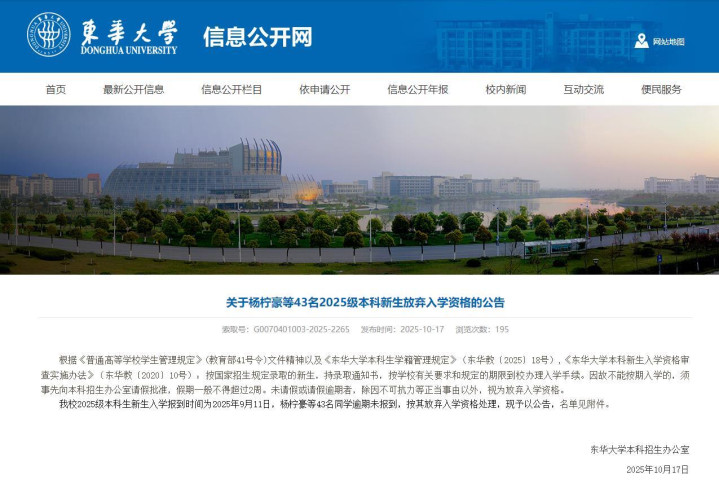 记者在该校官网上查询到,10月17日,该校发布关于43名2025级本科新生放弃入学资格的公告,公告称,根据《普通高等学校学生管理规定》(教育部41号令)文件精神以及《东华大学本科生学籍管理规定》(东华教〔2025〕18号),《东华大学本科新生入学资格审查实施办法》(东华教〔2020〕10号):按国家招生规定录取的新生,持录取通知书,按学校有关要求和规定的期限到校办理入学手续。因故不能按期入学的,须事先向本科招生办公室请假批准,假期一般不得超过2周。未请假或请假逾期者,除因不可抗力等正当事由以外,视为放弃入学资格。我校2025级本科生新生入学报到时间为2025年9月11日,有43名同学逾期未报到,按其放弃入学资格处理,现予以公告。